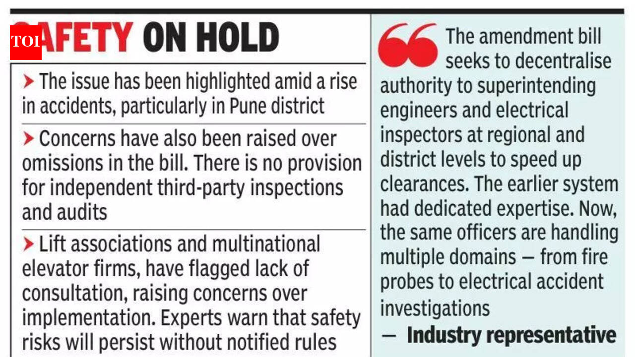 पुणे: महाराष्ट्र लिफ्ट्स, एस्केलेटर आणि मुव्हिंग वॉकवे कायदा, 2017, कार्यान्वित करण्याच्या नियमांच्या विलंबामुळे मंजूर होऊन नऊ वर्षे उलटूनही प्रलंबित आहे, जरी लिफ्टशी संबंधित अपघातांमुळे राज्यभरात